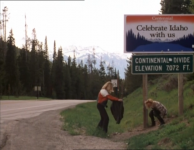 The two biker chicks Jane (Sherrie Rose) and Will (Melissa Behr) stop to take a leak by the side of the road in front of a "Welcome to Idaho" sign. Each squats in the grass while the other holds a jacket in front of her. Shown from the side. (50:45)