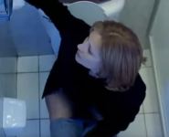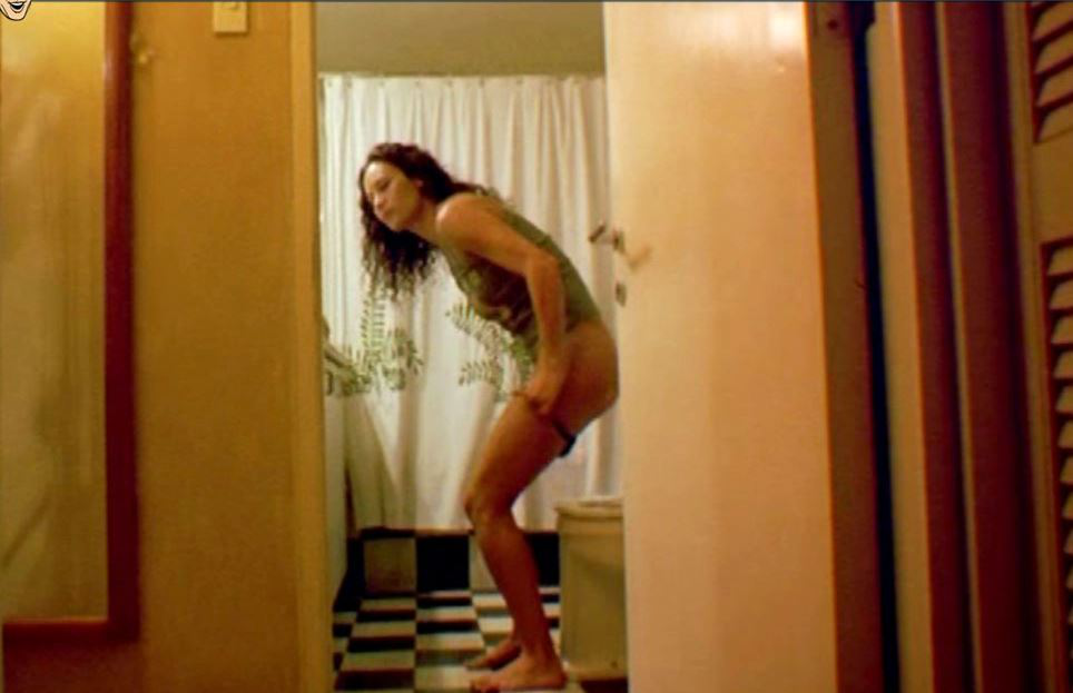 A woman sits on the toilet. She is shown wiping and then getting up from the toilet, but there are no pee sounds.