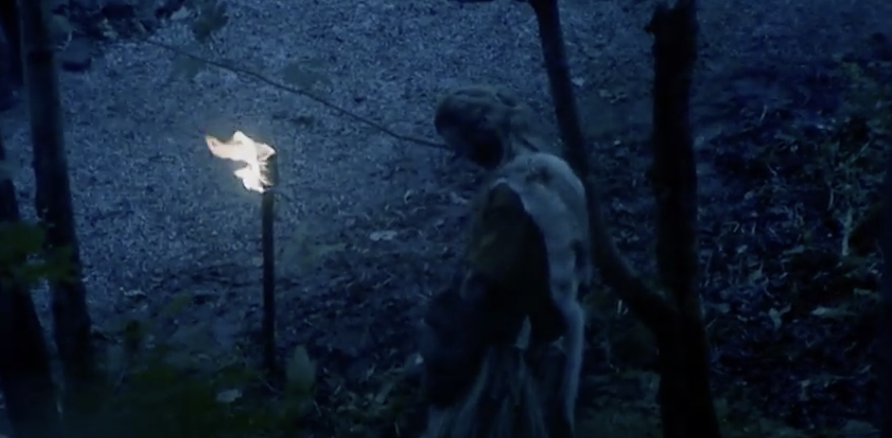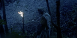 One of the Vikings pees at the edge of his camp as two of the villagers spy from the woods.