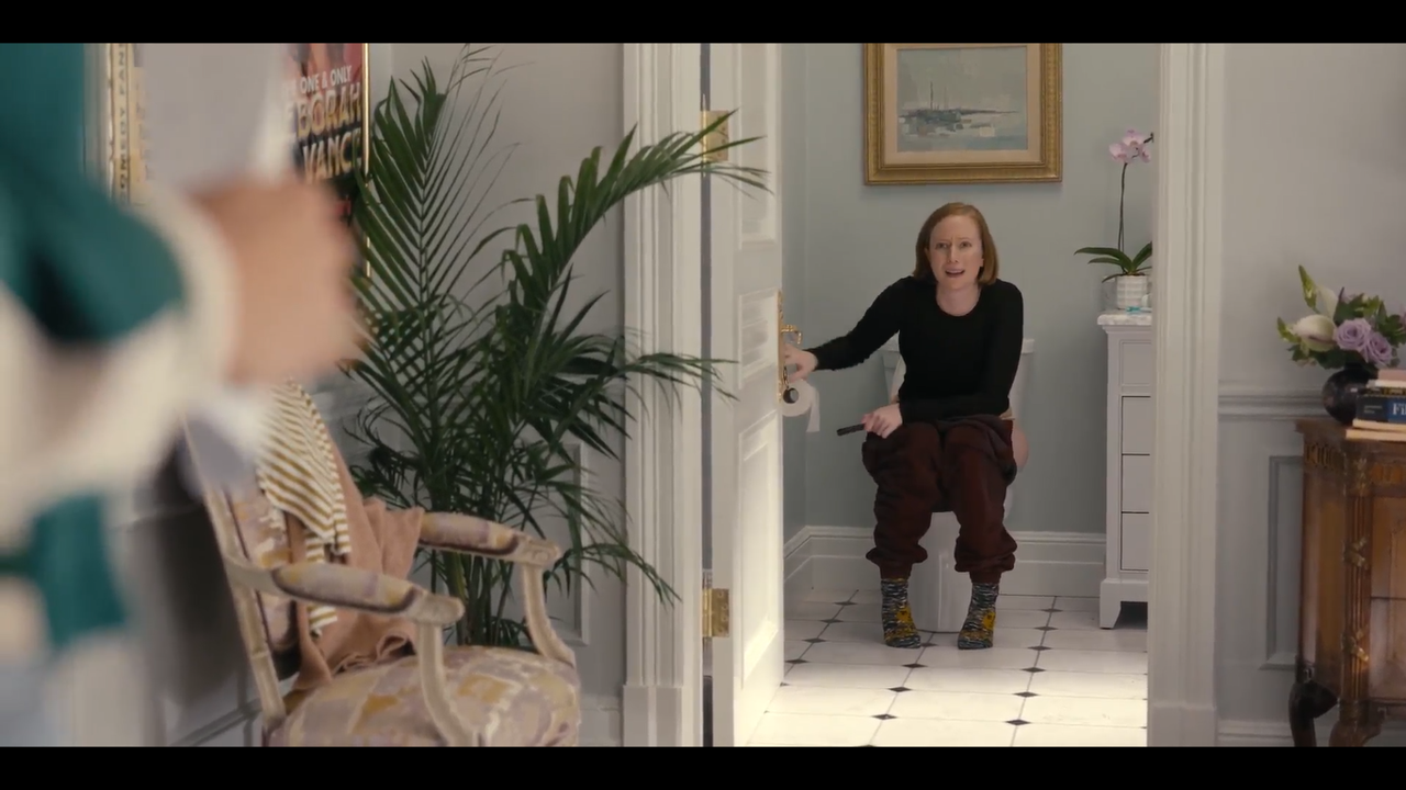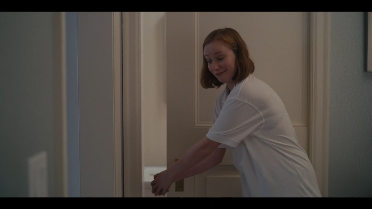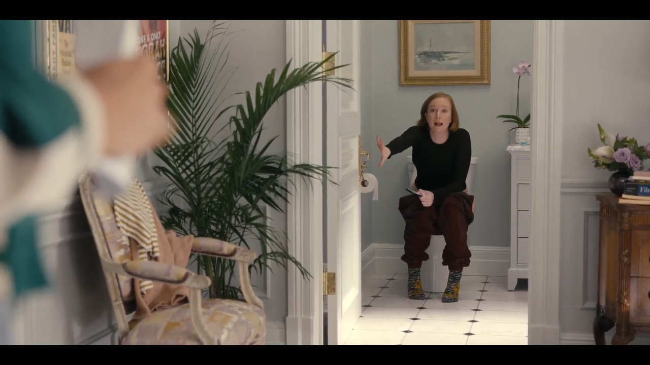 Deborah (Jean Smart) needs to pee but Ava insists on accompanying her because she has been bedridden. She then relents and goes into the bathroom and half closes the door but Ava holds her hand through the door and comments on the strength of the stream much to Deborah's annoyance.