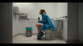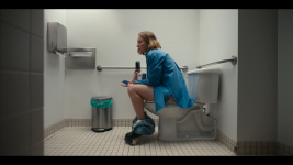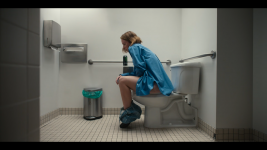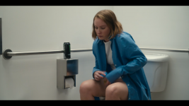 Deborah needs to use the bathroom while at an outdoor party where there are porta-potties for guests to use. The host whom she previously slept with offers her to use the bathroom in doors but after he threatens her into not revealing their affair Deborah decides to use the porta-potties outside. She is then shown exiting the porta-potty in disgust as she kicks some toilet paper off of her shoe that's still stuck to it.