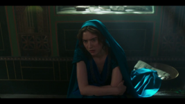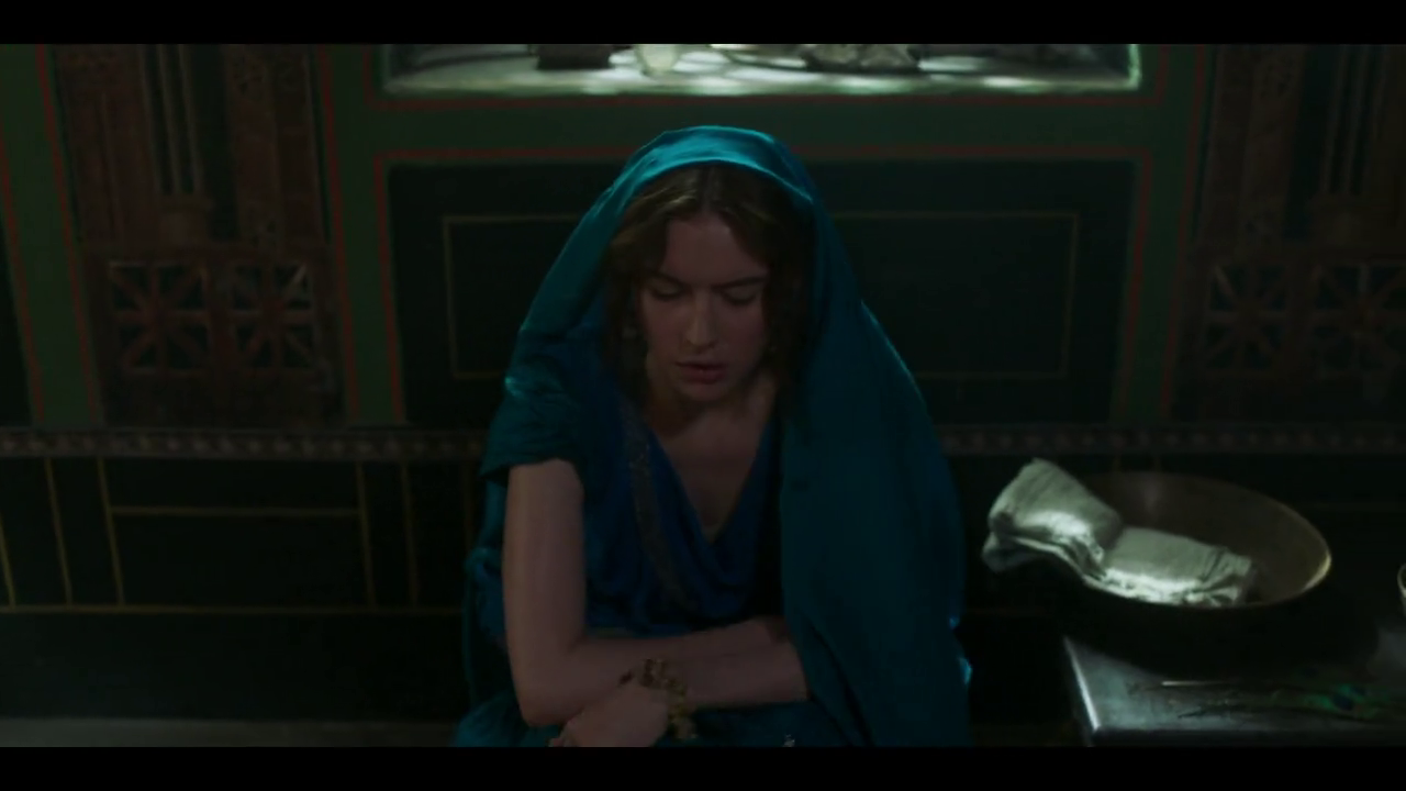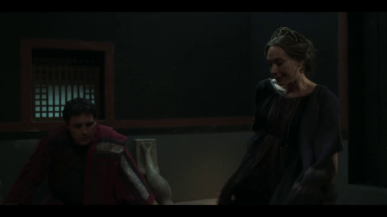 Livia (Kasia Smutniak) is seen slightly obscured, angrily sitting on a Roman toilet to pee. Then calls for someone when there is nothing to clean herself with.