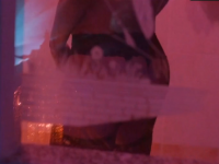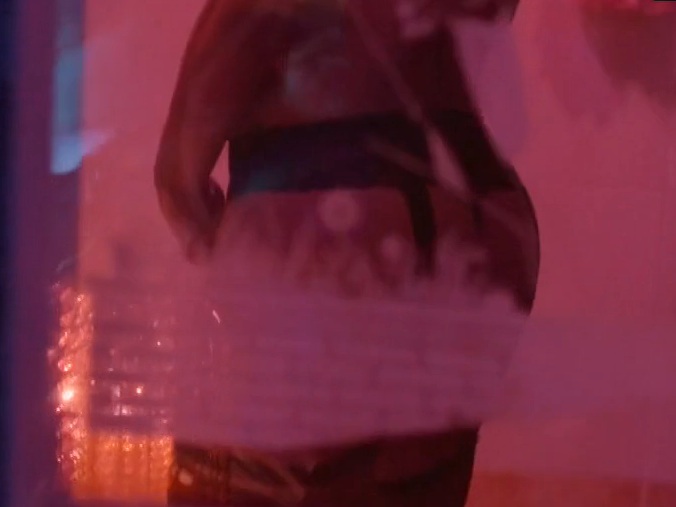A trans woman can be seen peeing in the toilet while standing up, her penis is censored through a design that had been frosted into the glass. Her butt can be seen while she's shaking herself off and her penis can be seen when she walks out of the bathroom.
