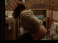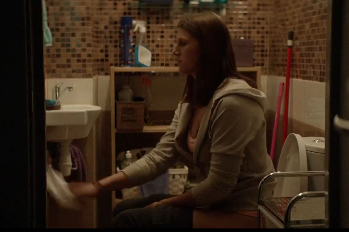 There is a brief scene of Zhenya (Maryana Spivak) sitting on the toilet, wiping, and flushing. (around 13 minutes in)