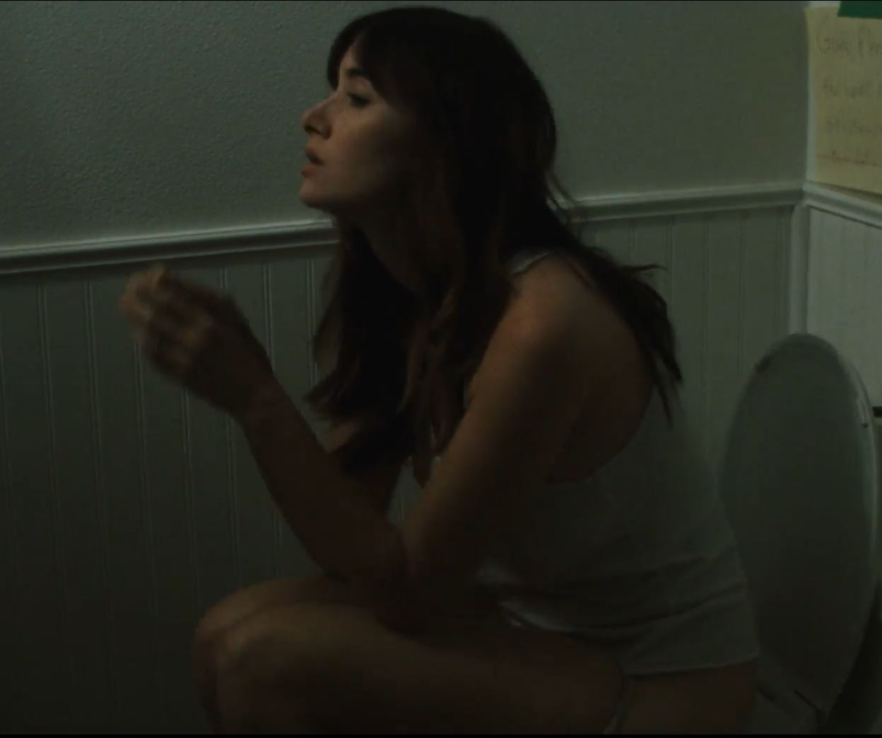 Sara Malakul Lane wearing beige panties and a white tanktop with no bra and hard nipples as she pulls her panties down a bit and then sits on a toilet and urinates for a while as she practices an acting scene before standing and pulling her panties back up