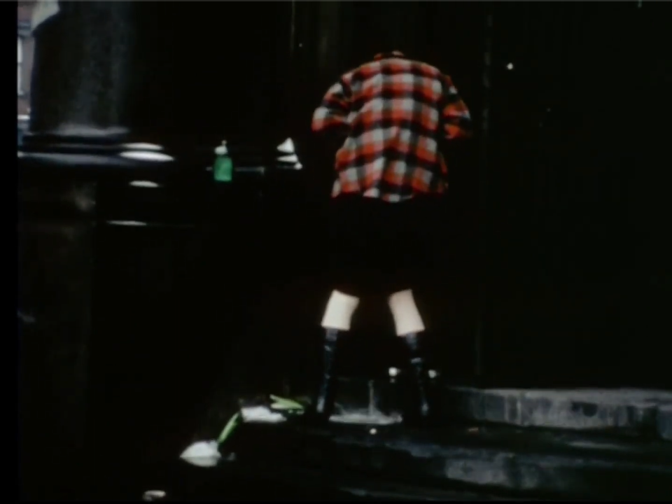 A transwoman stands and drunkenly urinates in public. A stream of urine is shown splashing on the pavement.