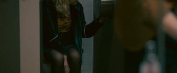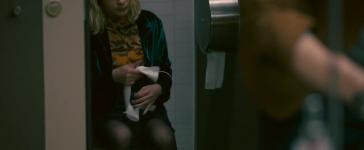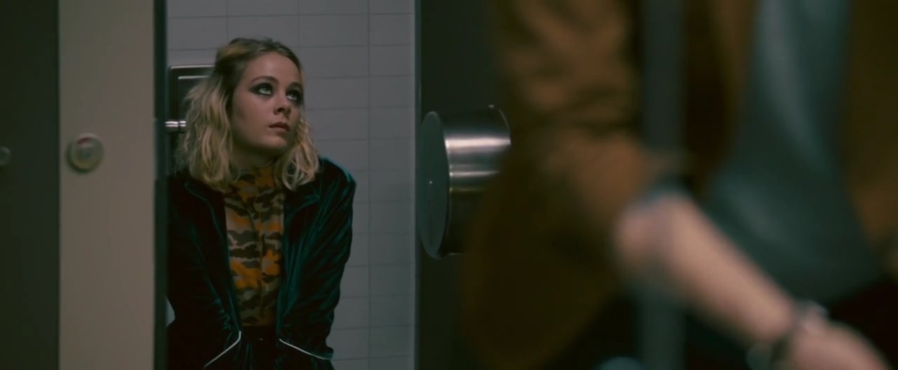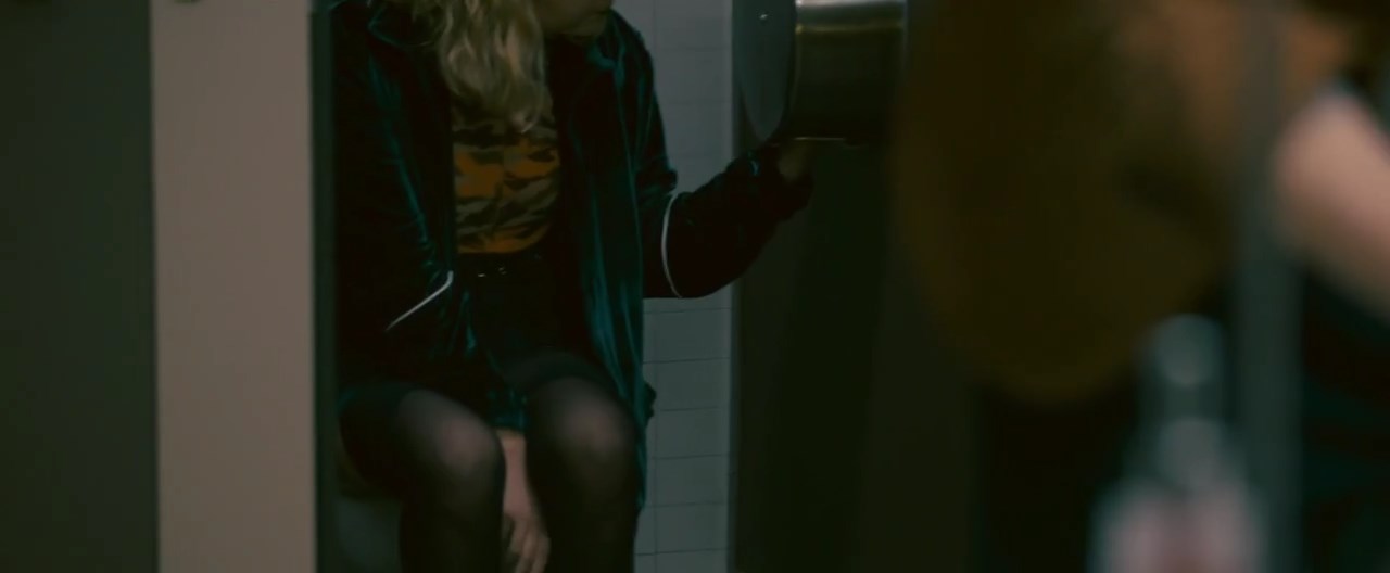 Texel Textor (Athena Strates) walks into the men's bathroom as Jeremiasz Angust (Tomasz Kot) washes his hands. She sits and audibly pees in a stall with the door open. (0:29:50)