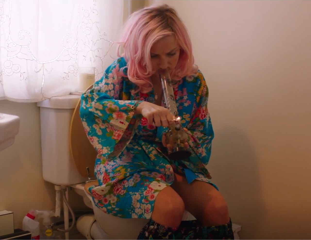 Alex (Faye Marsay) is shown sitting on the toilet, peeing while smoking a bong. She sighs and moans in relief but it could be from inhaling the bong. She then spots a photo of her and her girlfriend Olivia (Lucy Punch) and tries to grab hold of it but ends up falling off the toilet.