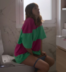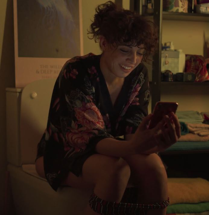 Nerea is shown sitting on the toilet scrolling on her phone.