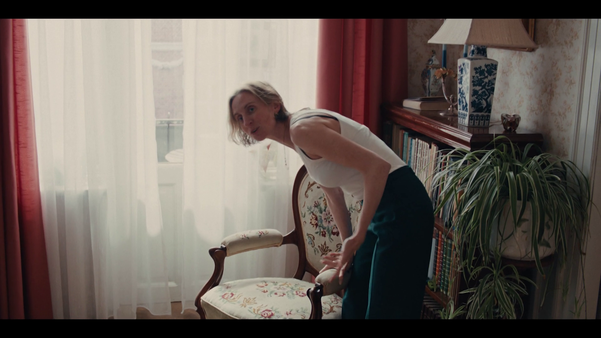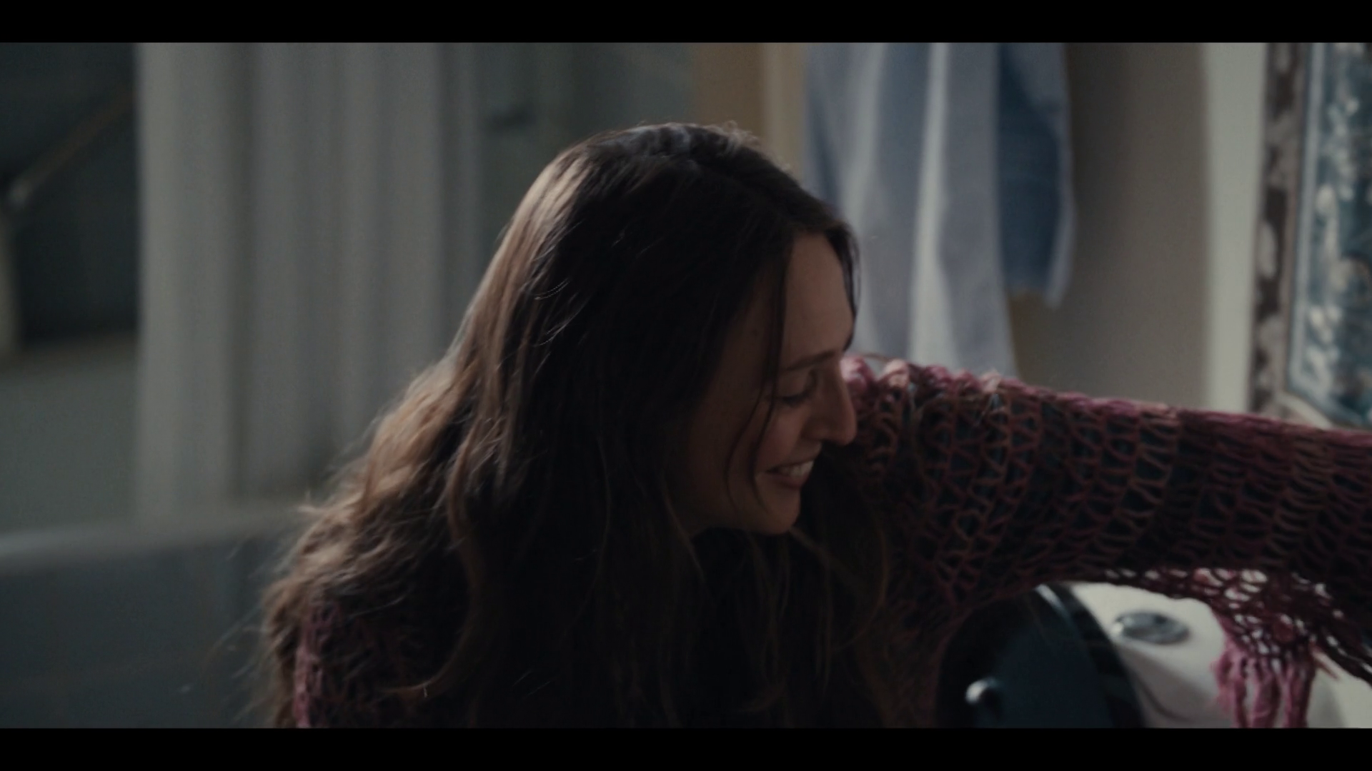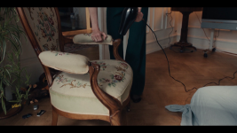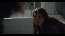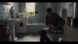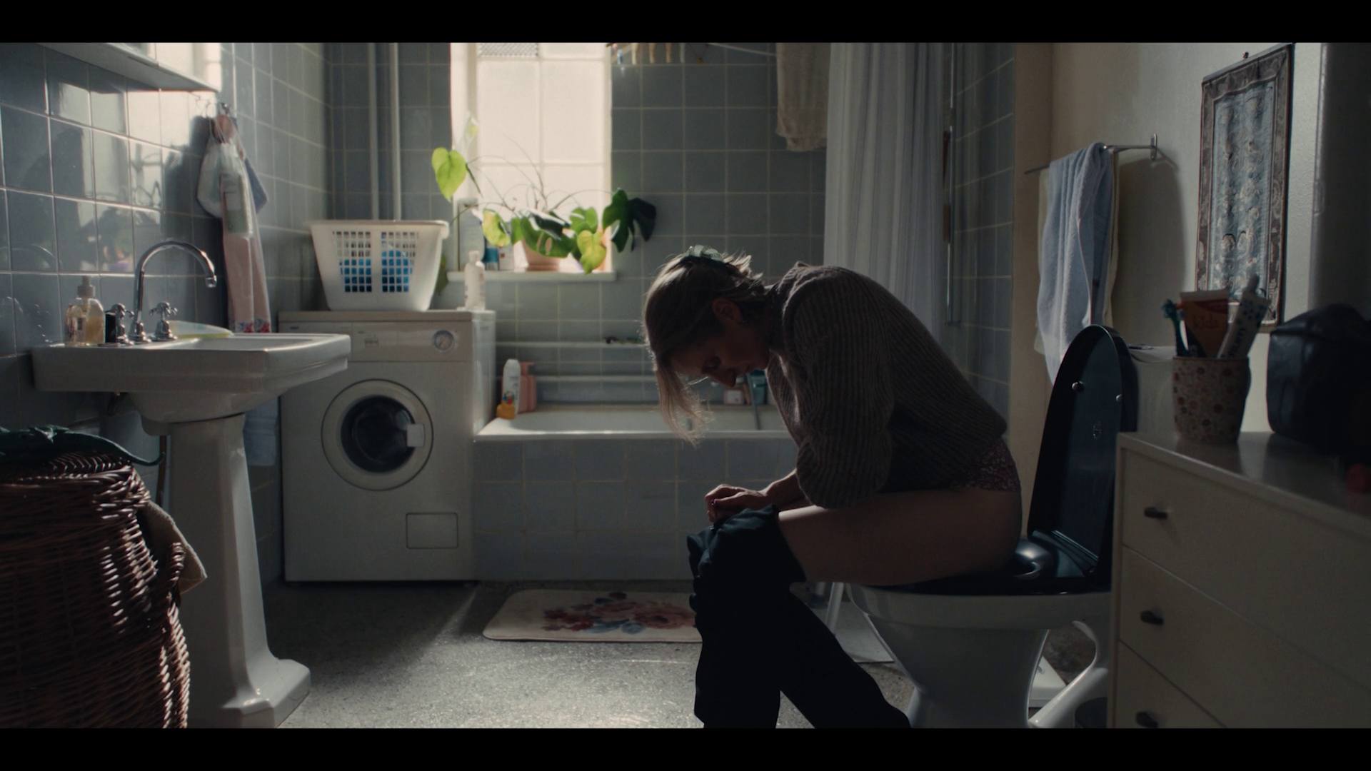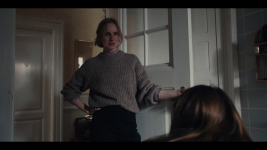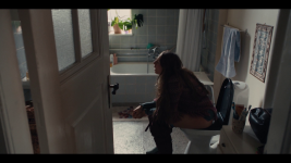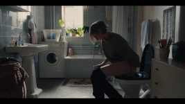 Anne Sofie (Alice Bier) who had rang on the doorphone rushes into the entrance hall and quickly drop her jacket and bag on the floor and hurries to the bathroom and sits on the toilet to pee. Her and Rikke talks together the entire time.