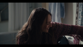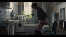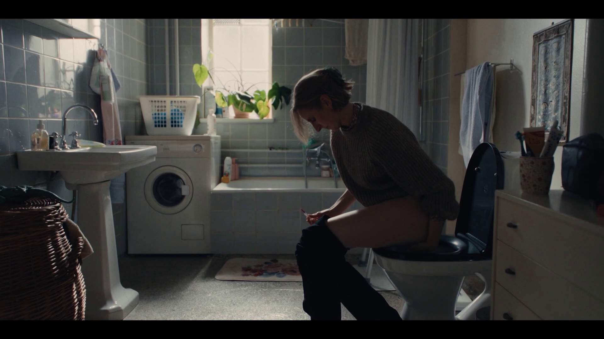 Rikke (Rikke Eberhardt Isen) is sitting on the toilet taking a pregnancy test. The doorphone to the arpartment rings and she is rushed to finish to anwser the phone.