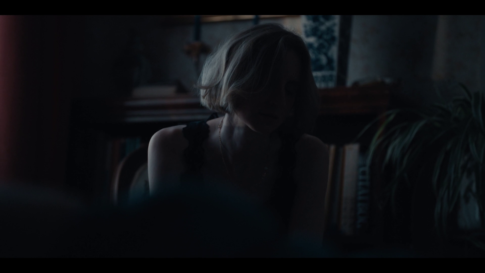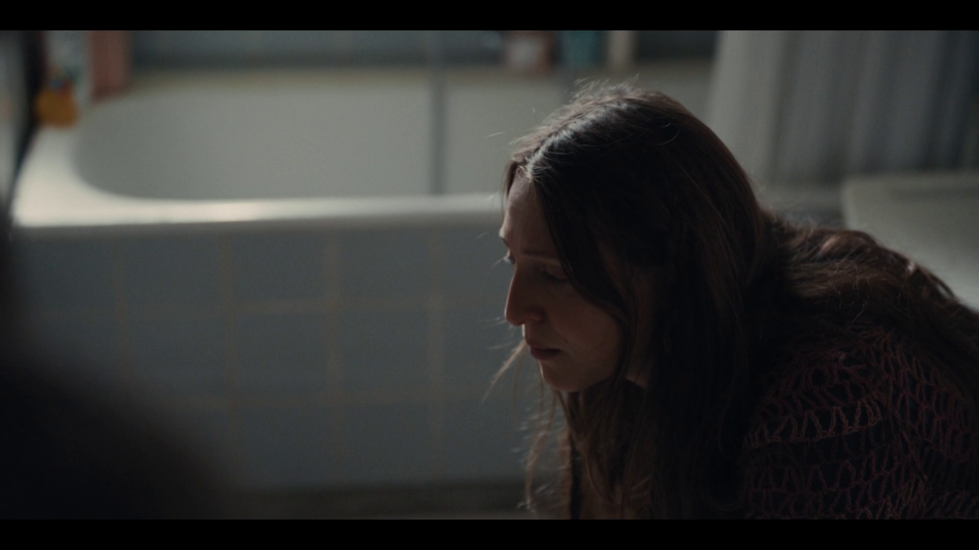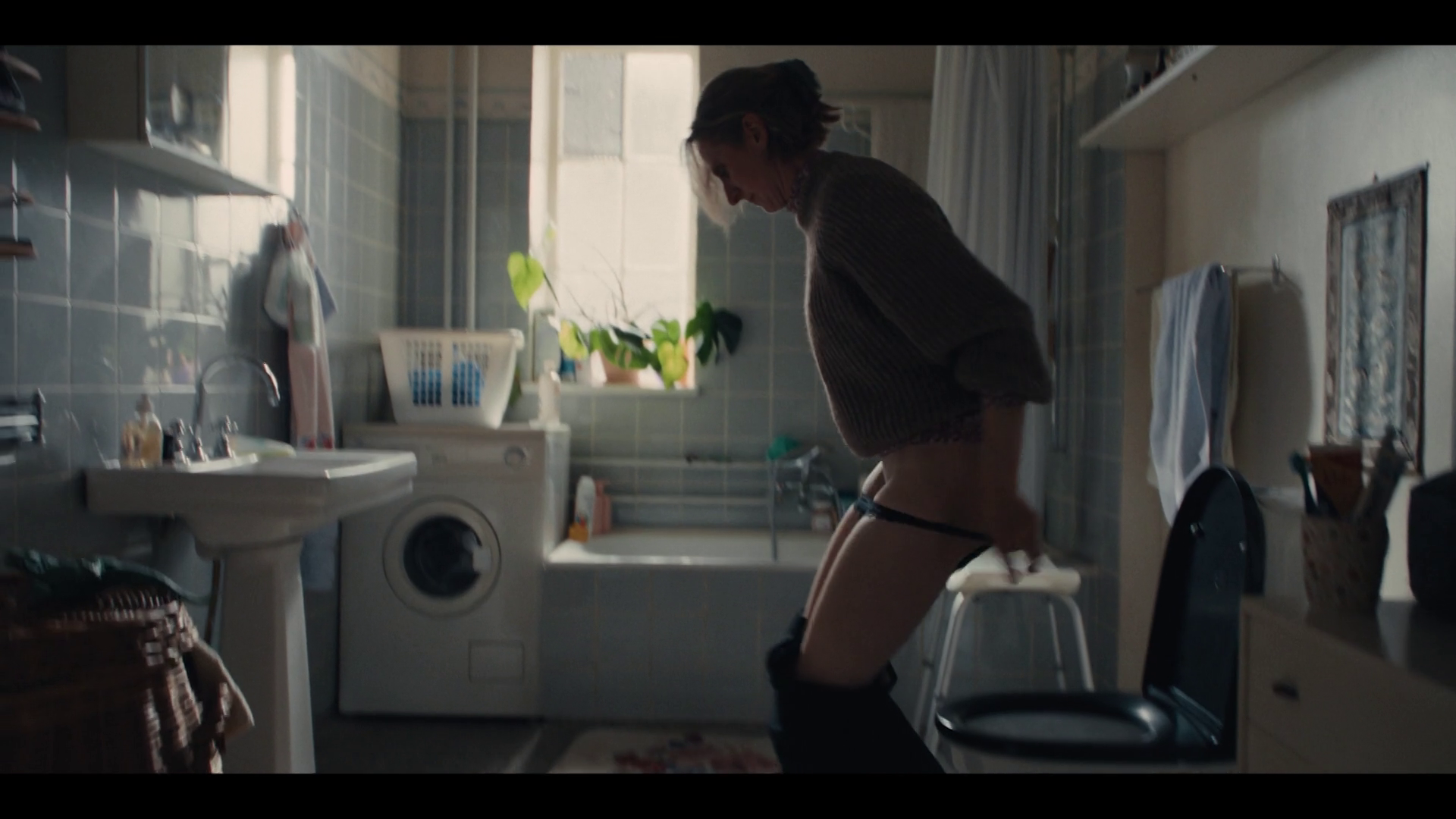 Anne.Sofie (Alice Bier) wakes up at night, and starts coughing, after it settles she goes to the bathroom to pee, she is seen pulling her pajama pants down and sitting on the toilet peeing. This turns out to be a dream and when she wakes up, we see that she has wet herself and the bed.