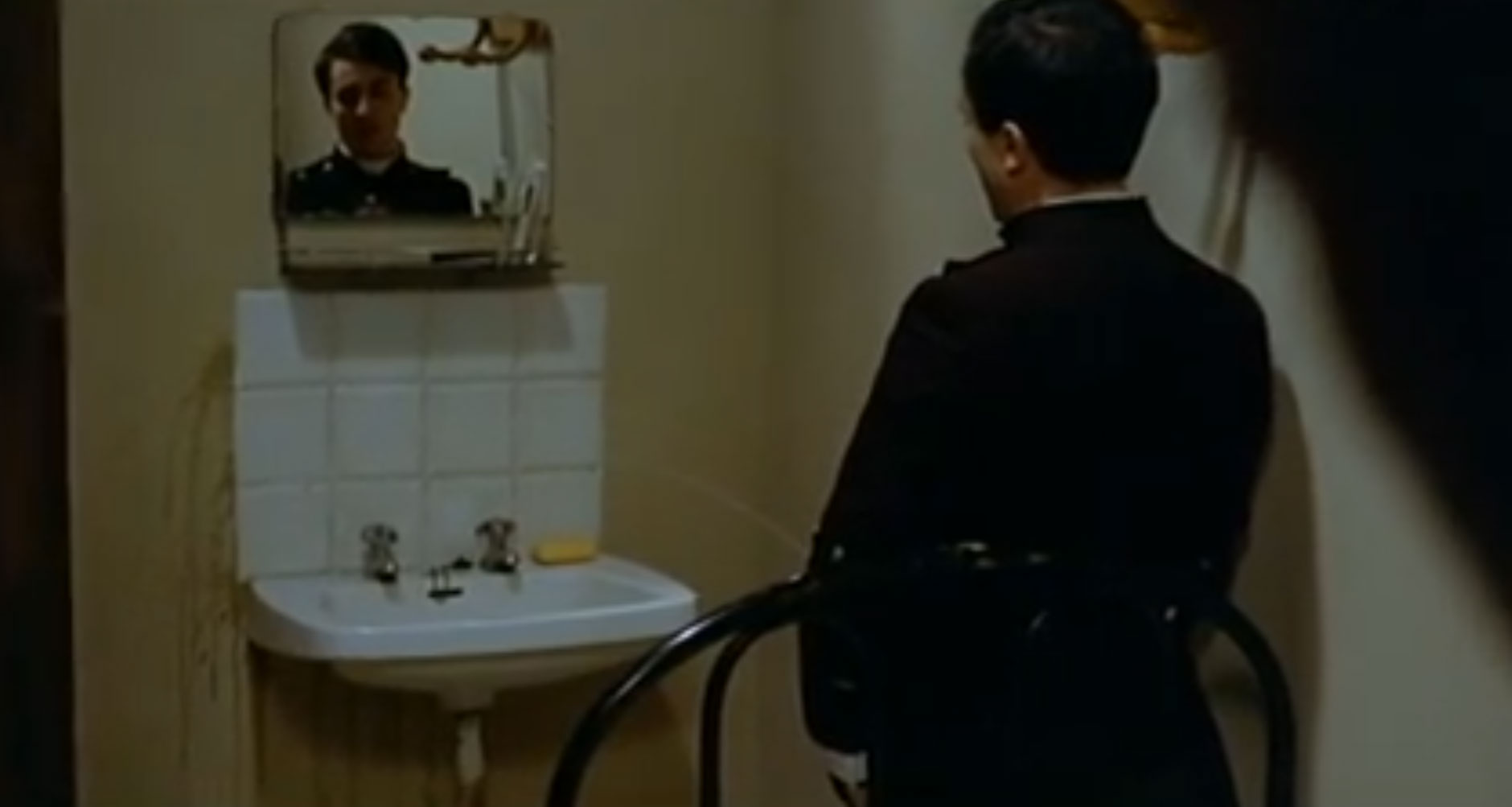 A seminarian watches another seminarian in his cell while he is peeing in the sink. (1:17:25)