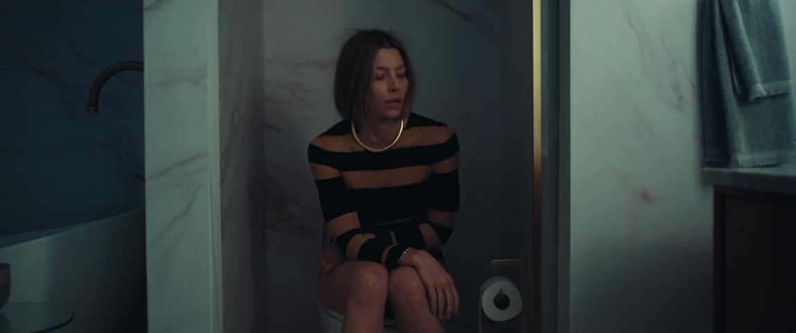 Chloe (Jessica Biel) is shown sitting on the toilet peeing as she talks to Adam (Corey Stall). Her underwear is shown at her feet and she sighs in relief and is shown wiping and flushing the toilet.