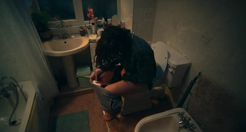 Suzie is laying in bed. She then grimaces as she is then shown sitting on the toilet, pants pulled down and underwear shown as blood is shown it. She is then shown wiping and making a pad and flushing the toilet and then pulls up her pants and underwear. A montage is then shown of her then sitting on the toilet and finding blood and repeating the same action until it ends with her sitting in the bathtub.