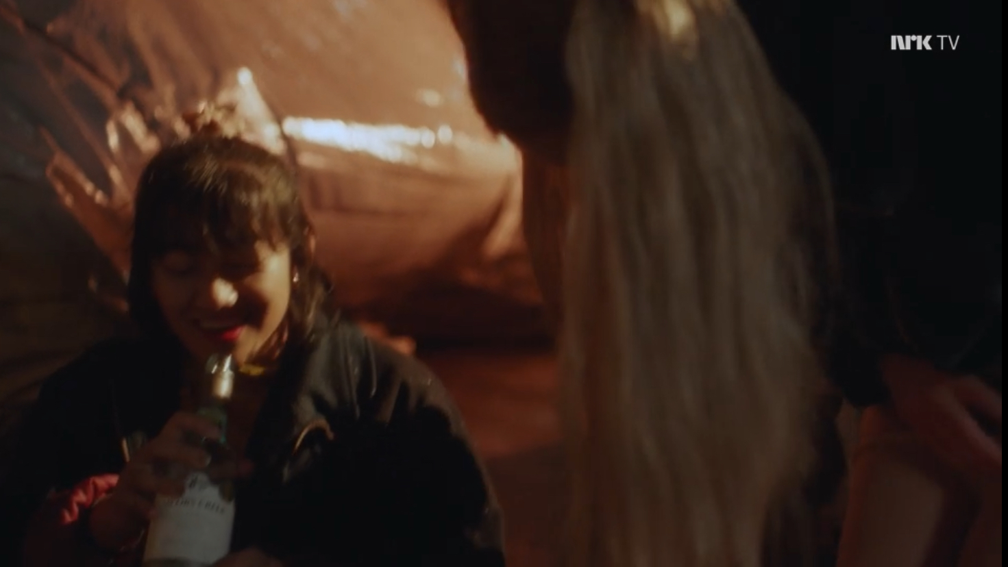 One of the opening scenes. The main character urinates besides her friend in the rain between a few boats. Her friend claims that she peed on her. The camera switches between regular and phone footage. Not much is shown.
