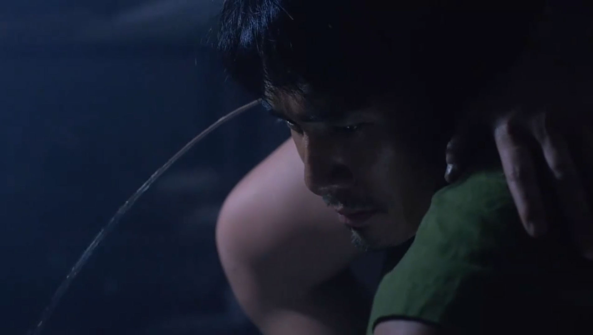 Ching On (Tony Leung Chiu-wai) carries a convict on his shoulders to the bathroom to make him urinate and while he urinates some drops end up on his face. (26:43)