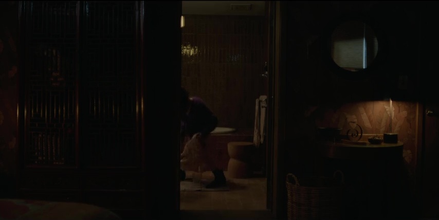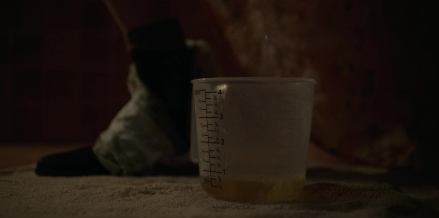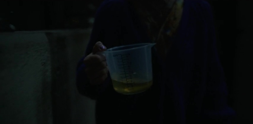 A woman brings a measuring cup into a bathroom, and squats and pees into it. stream is visible but clearly faked.