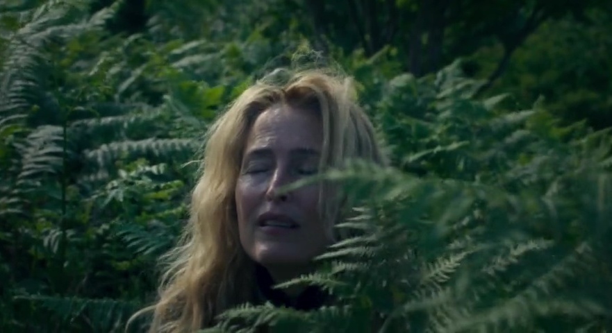 Ray (Gillian Anderson) wakes up in the morning, gets out of the tent she's camping and goes into the fields and pulls down her pants and squats to pee. She at first seems to find it difficult to start but she then manages to pee as she sighs in relief. She then sees a man walking along as she then finishes and pulls up her pants as the man chastises her for camping where she shouldn't be. Her and her husband who is ill are only doing so because they are forced too.