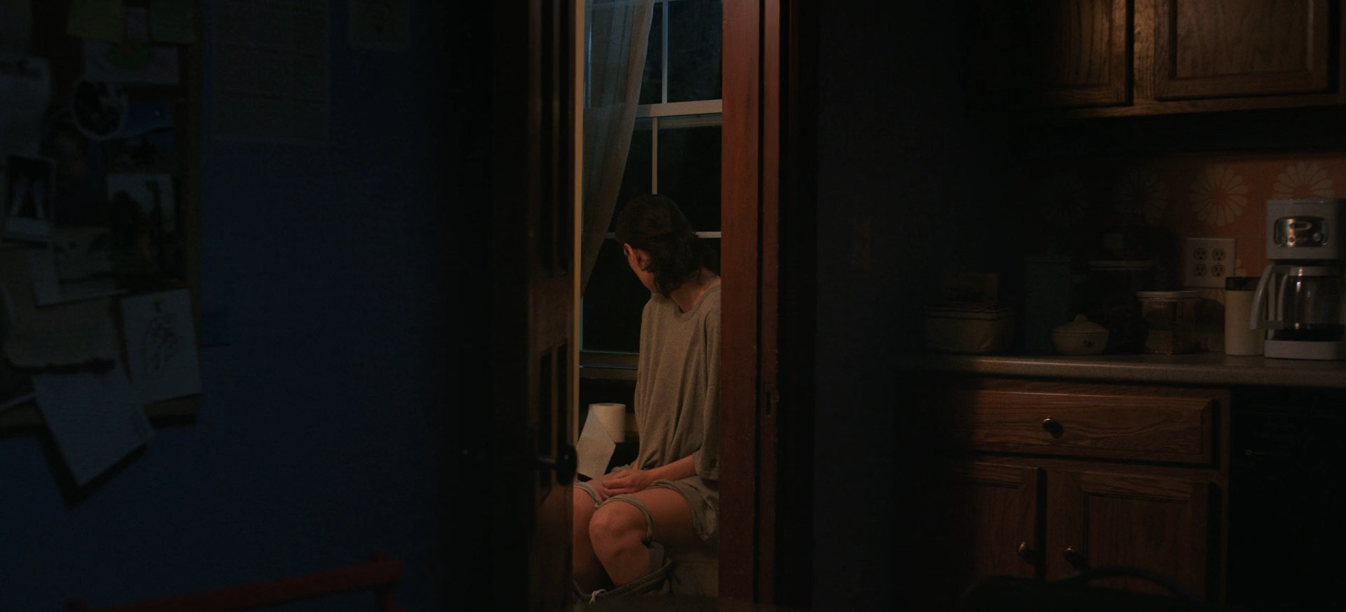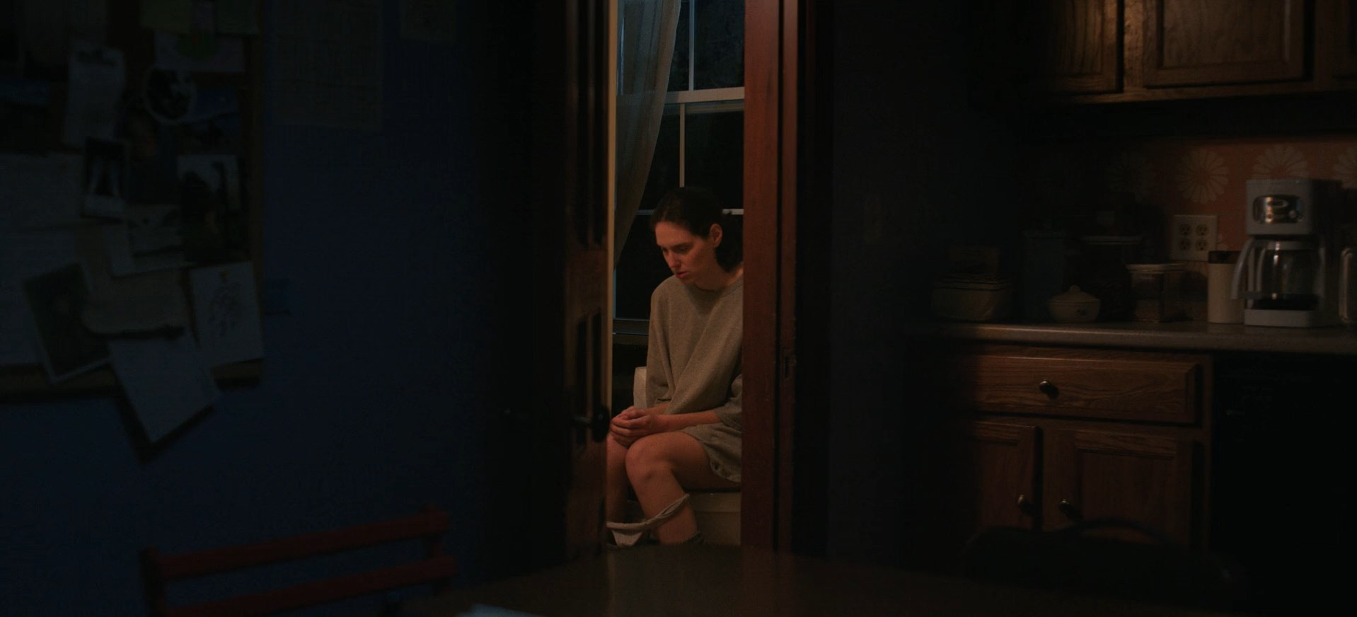 Agnes (Eva Victor) appears sitting on the toilet urinating.