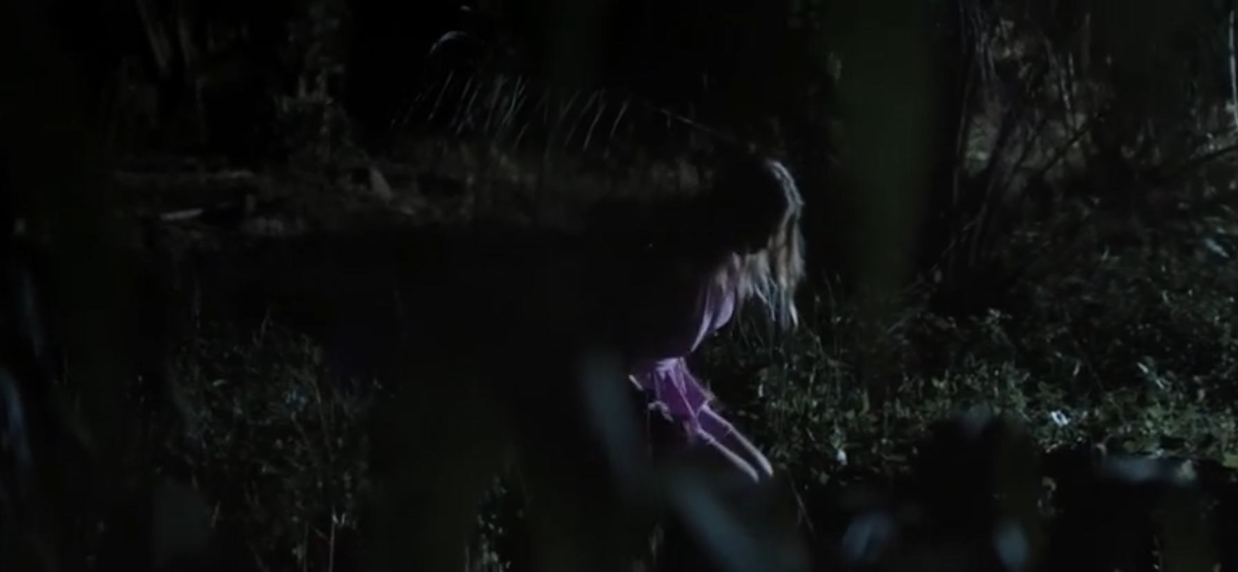 A woman pees in the woods at night. A faint sound is heard briefly.
