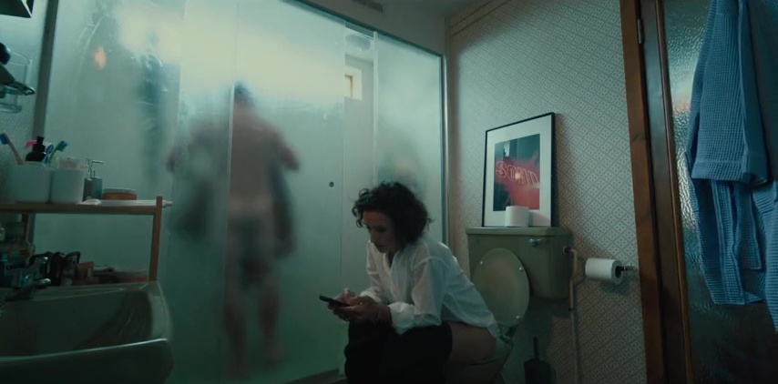 Fiona (Indira Varma) walks into the bathroom while John (Andrew Lincoln) is in the shower masturbating. She apologises saying she needs to pee. Her pants are already unbuttoned as she opens up the toilet, pulls down her open pants and sits down to pee. Audio is heard. She then starts scrolling through her phone. She is then shown wiping and flushing the toilet.