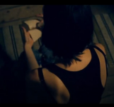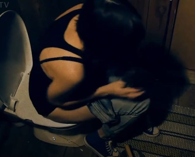 A girl takes some medicine and pulls down her jeans to use the toilet. When she wipes herself with toilet paper, she sees blood.