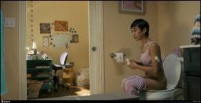 Margot (Brianne Tju) is seen sitting on the toilet.