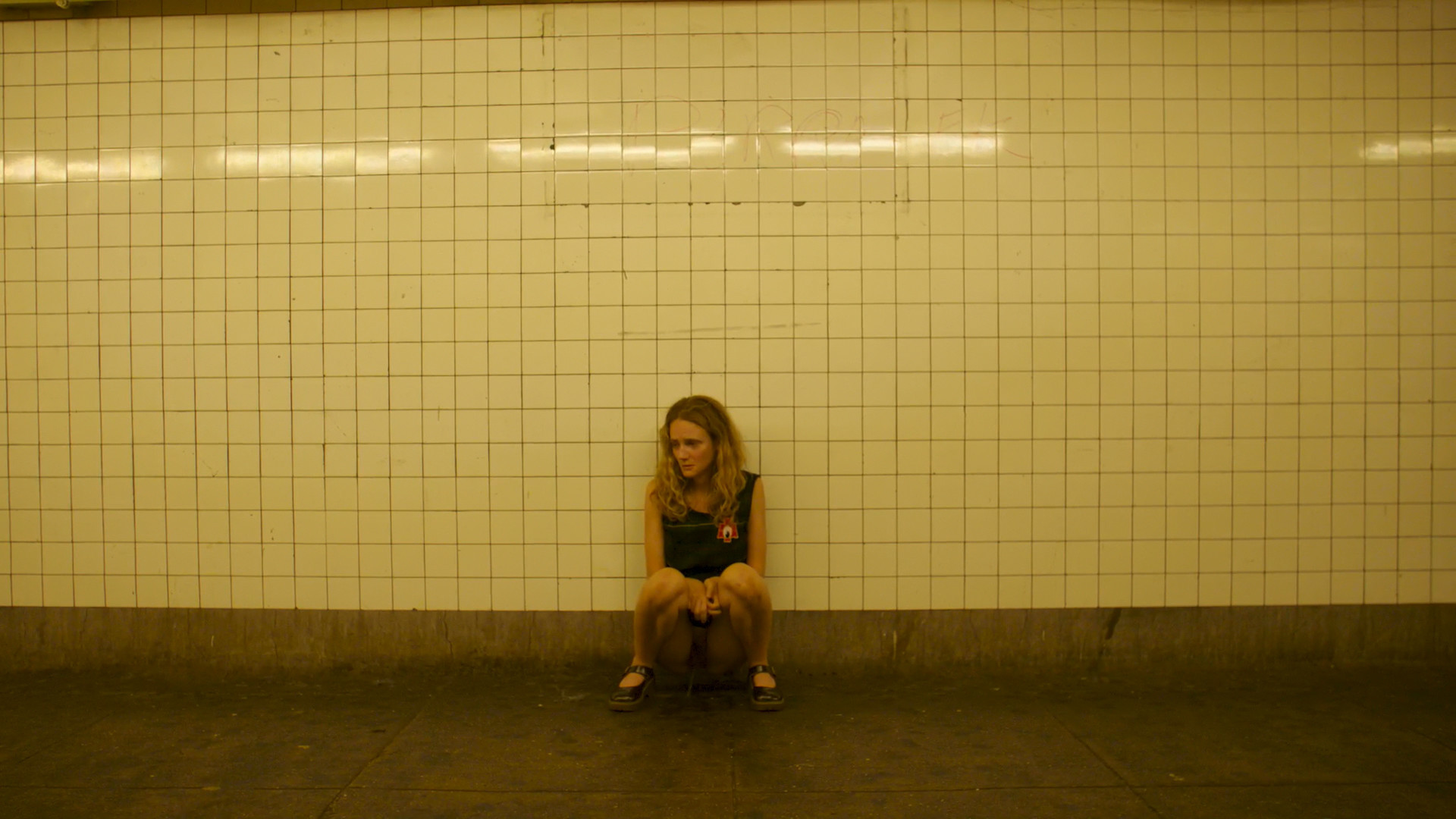 A girl takes off her panties and squats down to urinate in the subway station hallway. Her vagina is exposed and a small stream of urine is visible.