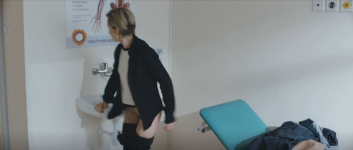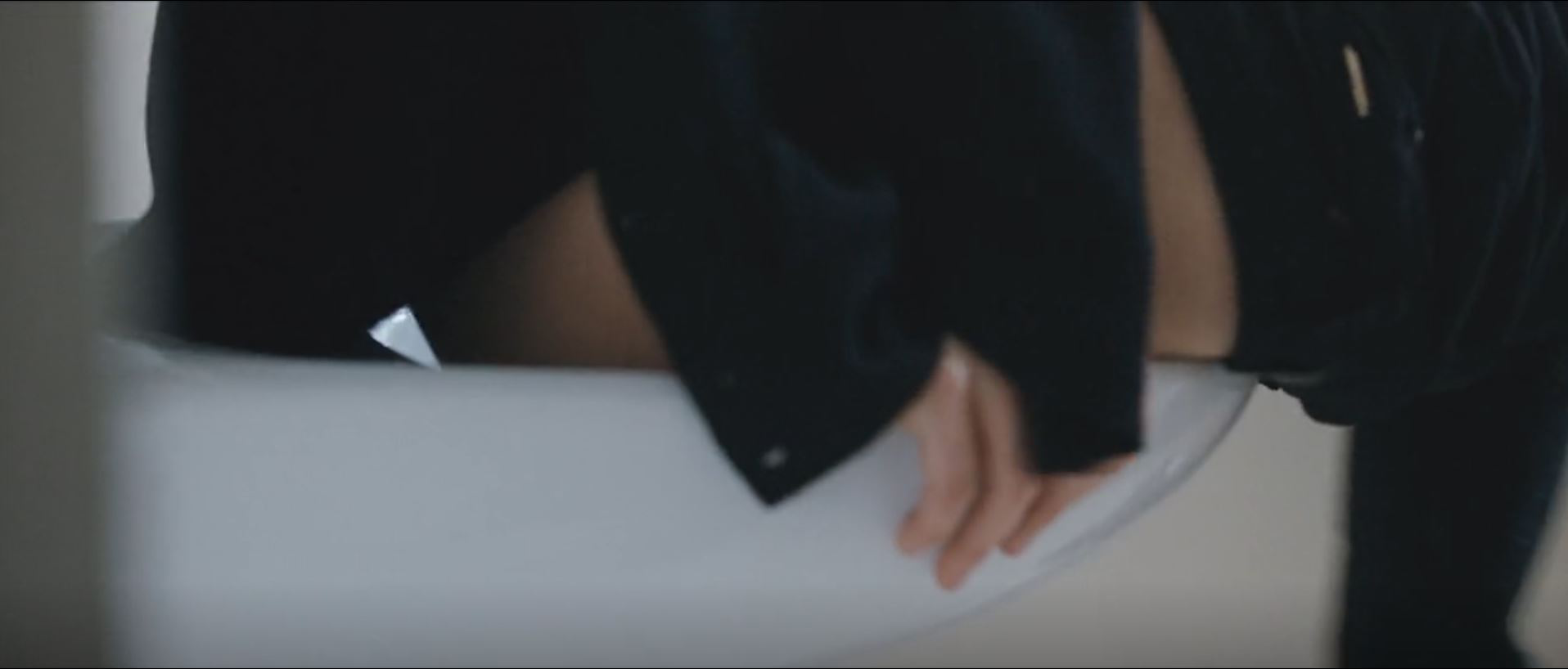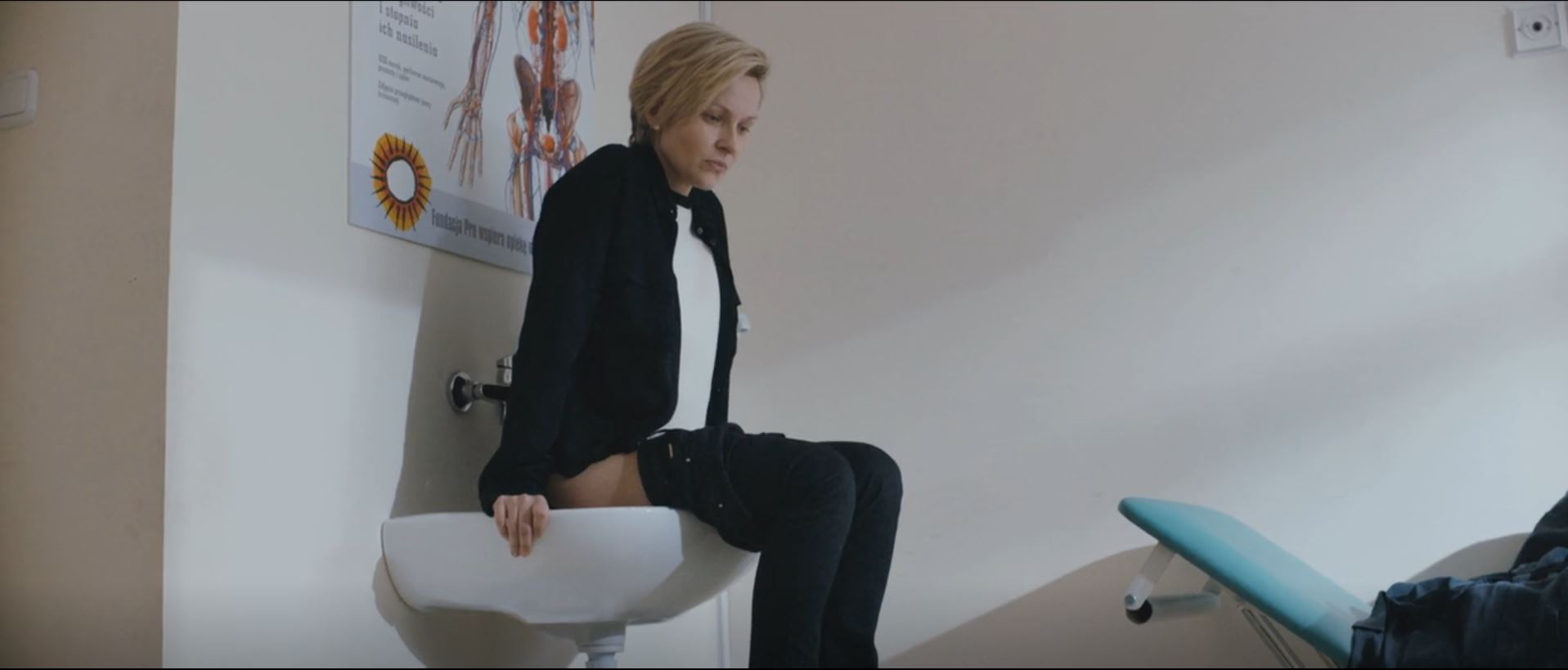 Dr. Patrycja Banach (Marieta Zukowska) pulls down her pants, exposing her butt, and turns around to sit on the sink to pee, but the sink breaks and she stumbles to the floor with her pants still down.
