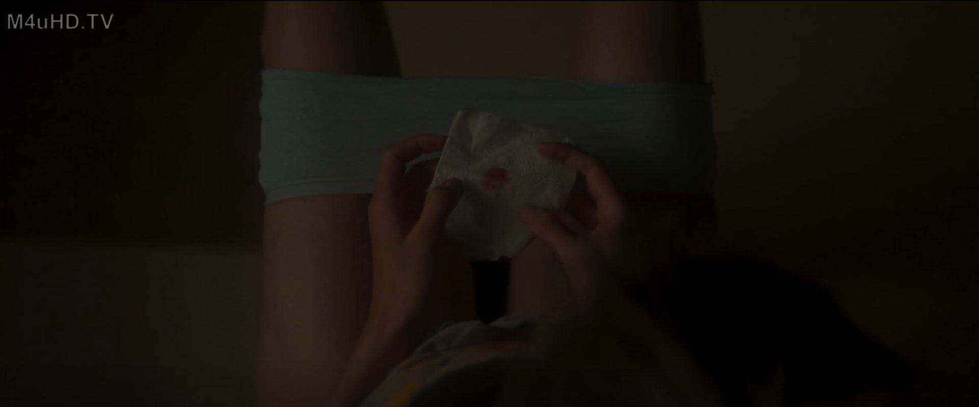 A girl appears sitting on the toilet and, as she wipes herself with toilet paper, a small spot of blood appears.