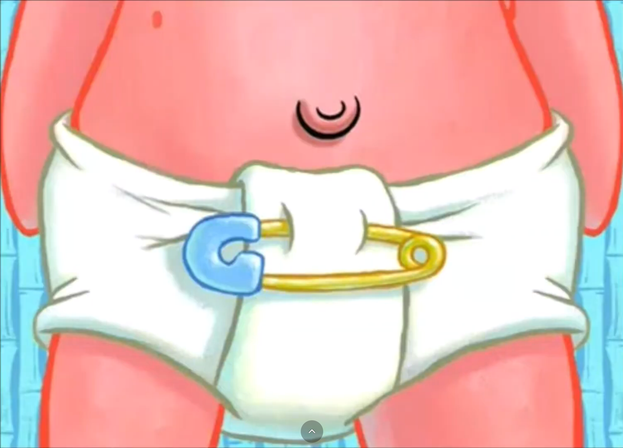 The baby scallop cries but fortunately Patrick figured out that he was wet so SpongeBob asks him how did he know to which he pulls down his pants revealing a terry diaper and he proudly says that he's been doing it all by himself for almost a year.