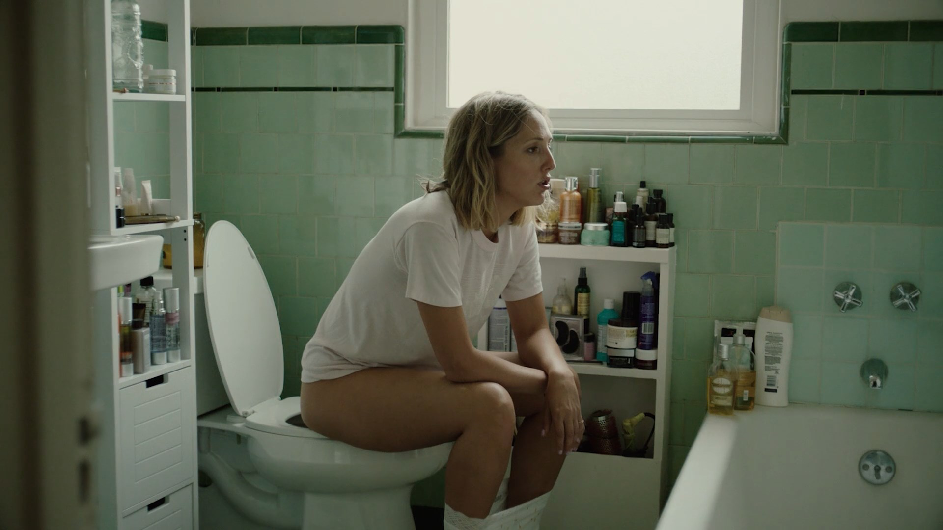 Gertie (Ingrid Haas) appears sitting on a toilet.