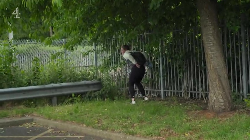 Jenni needs to pee while arriving at a train station. She complains she bursting and needs to wee in a bush. There is a quick blurred shot of her squatting behind a tree.