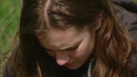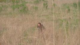 A woman is seen from the shoulders up as she urinates in a field. The sound goes on for quite a while.