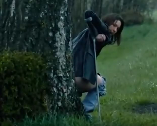 Barbara Hug (Marie Leuenberger) squats at a tree to pee while on a car rest stop. No audio, shot from the side from distance (at around 15:00 min)