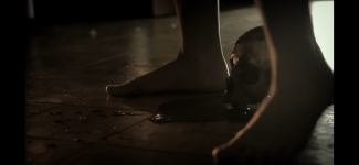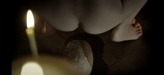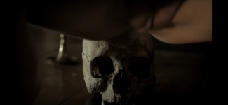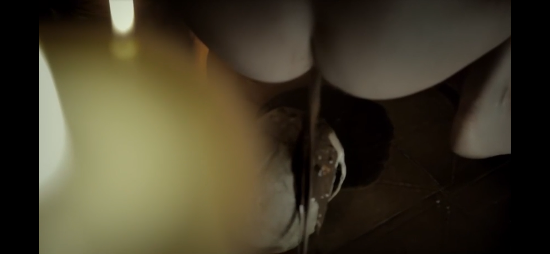 Later, the main character squats in front of the skull and urinates on it. We see the stream exiting from her vagina.