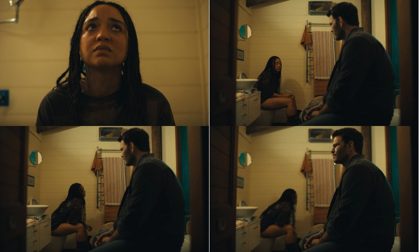Lina (Aisha Dee) appears sitting on the toilet taking a pregnancy test alongside her husband Dan (Josh Helman).