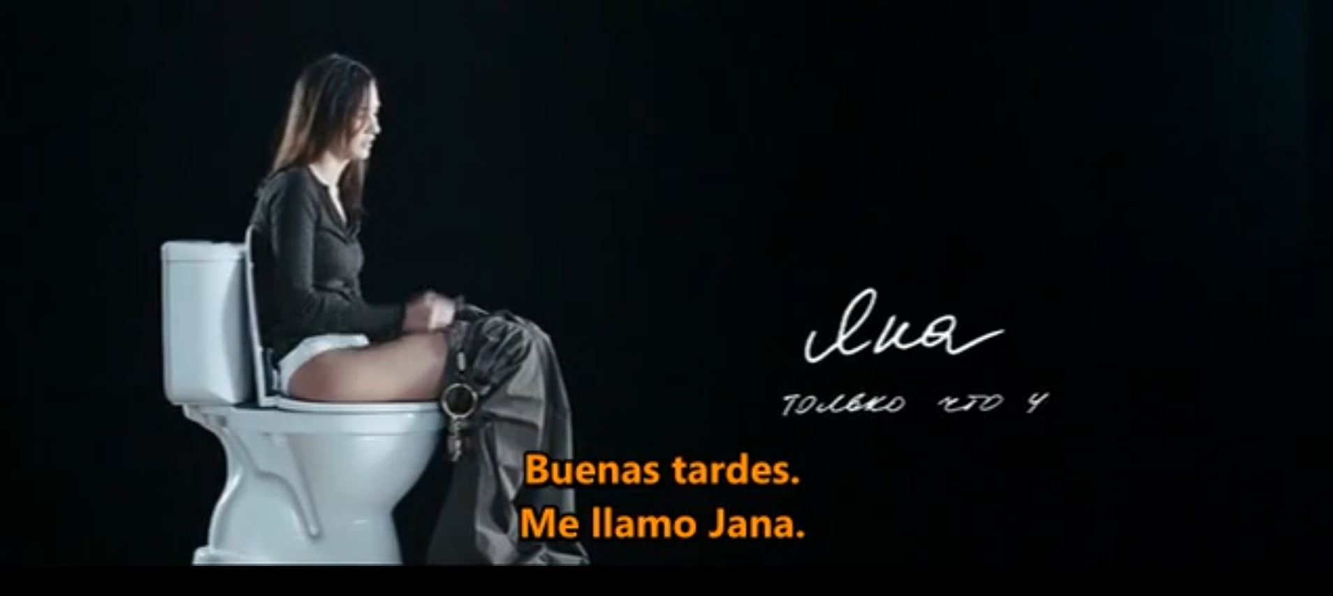 Jana (Evgenia Brik) appears sitting on the toilet during the introduction of characters to the reality show.