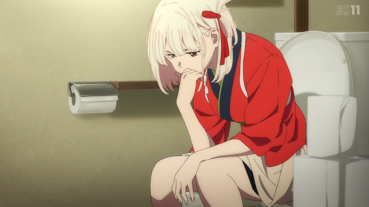 Chisato (Chika Anzai) says she needs to use the restroom. She is shown sitting on the toilet and says "Bar Forbidden?", a name that she saw on a phone earlier. She grunts out of frustration; when Kurumi (Misaki Kuno) hears this while outside, she assumes Chisato is constipated.