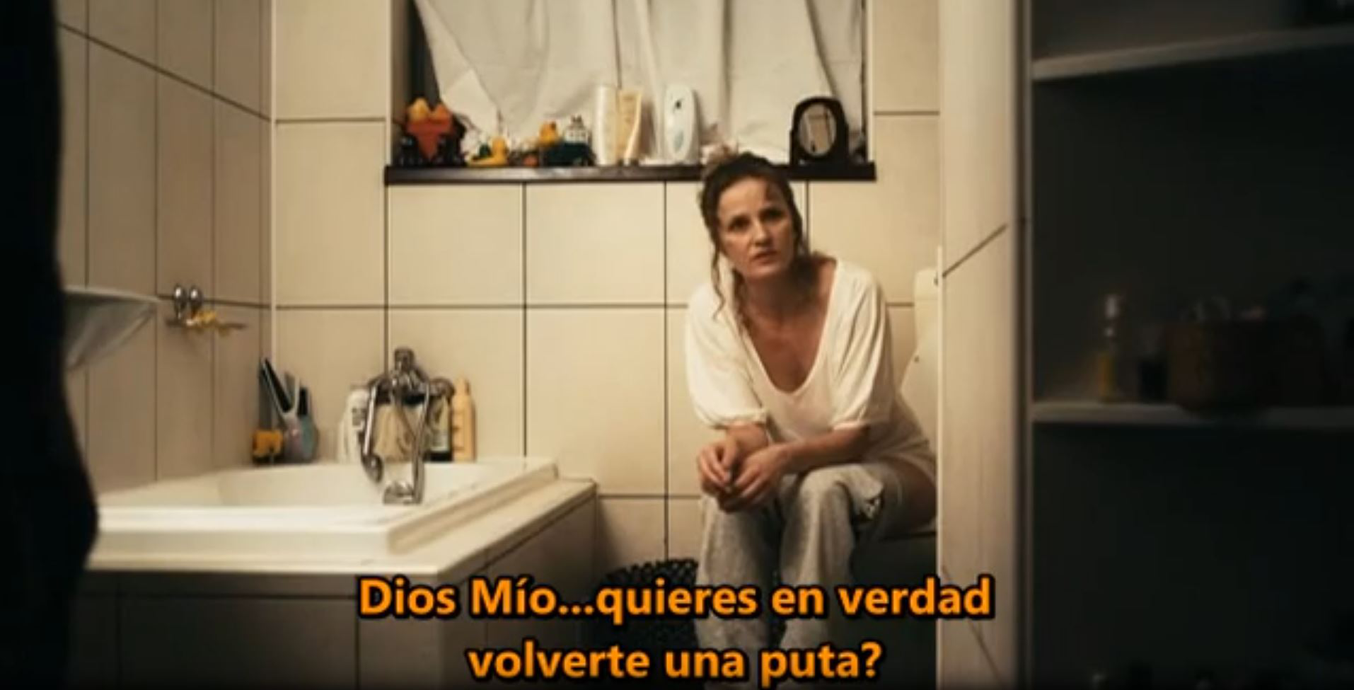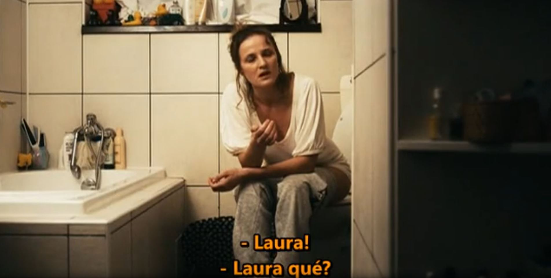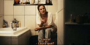 Laura (Crina Semcuic) goes to the bathroom with the door open and finds her mother sitting on the toilet.