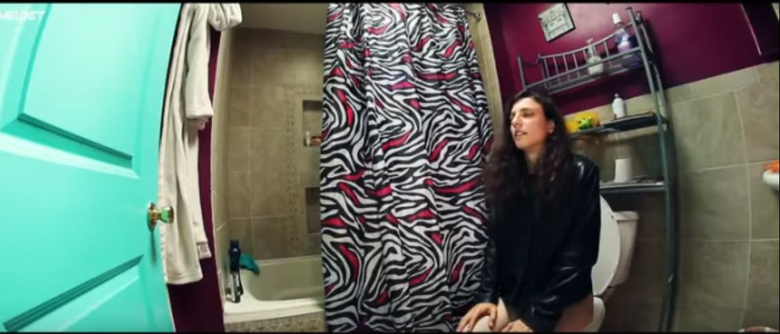 A woman pulls down her jeans and sits on the toilet. The sound of urine can be heard, and then she takes off her clothes to shower.