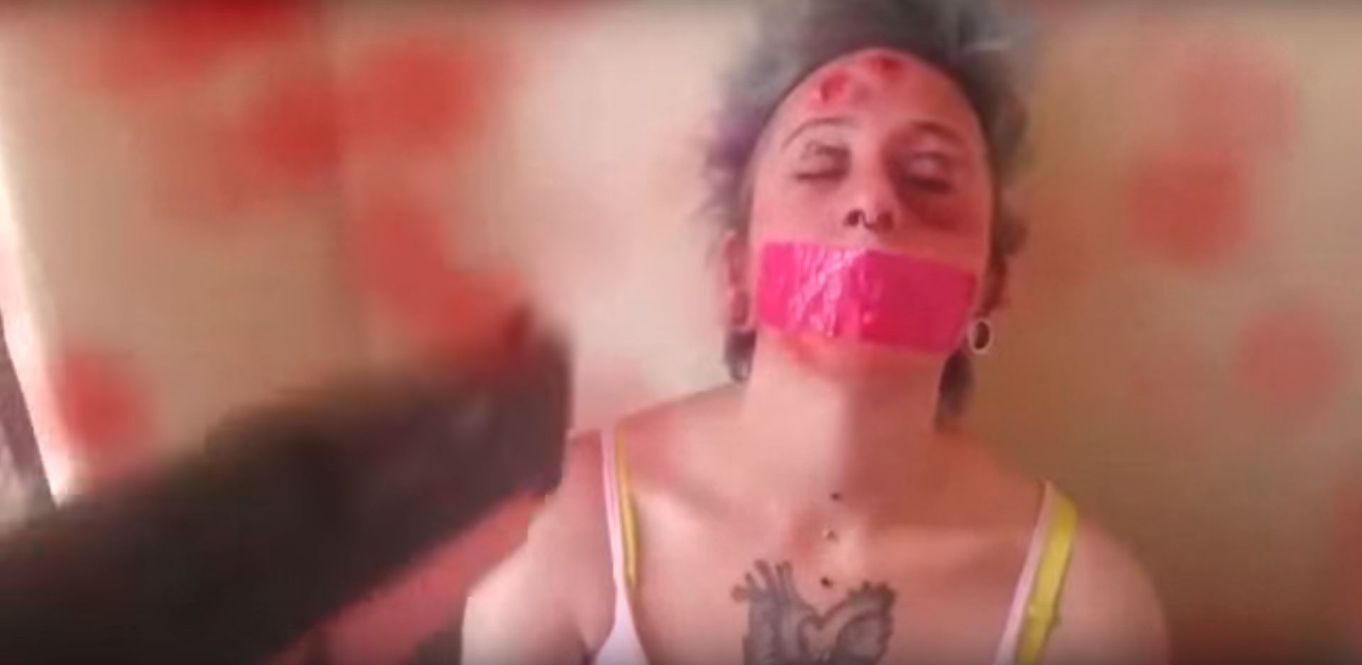 That same woman appears naked sitting on the toilet while another woman threatens her with a gun.