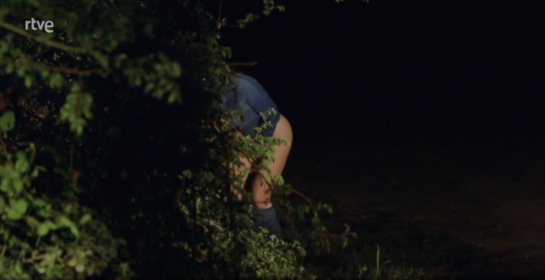 A woman stops to urinate behind the trees in the middle of the road at night.