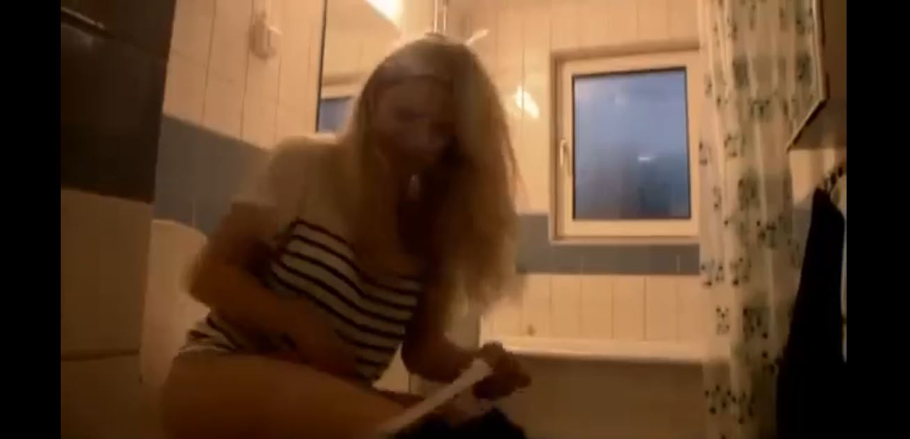 Alma (Mariah Kanninen) pulls down her pants and sits on the toilet. The bloodstain on her panties is shown.