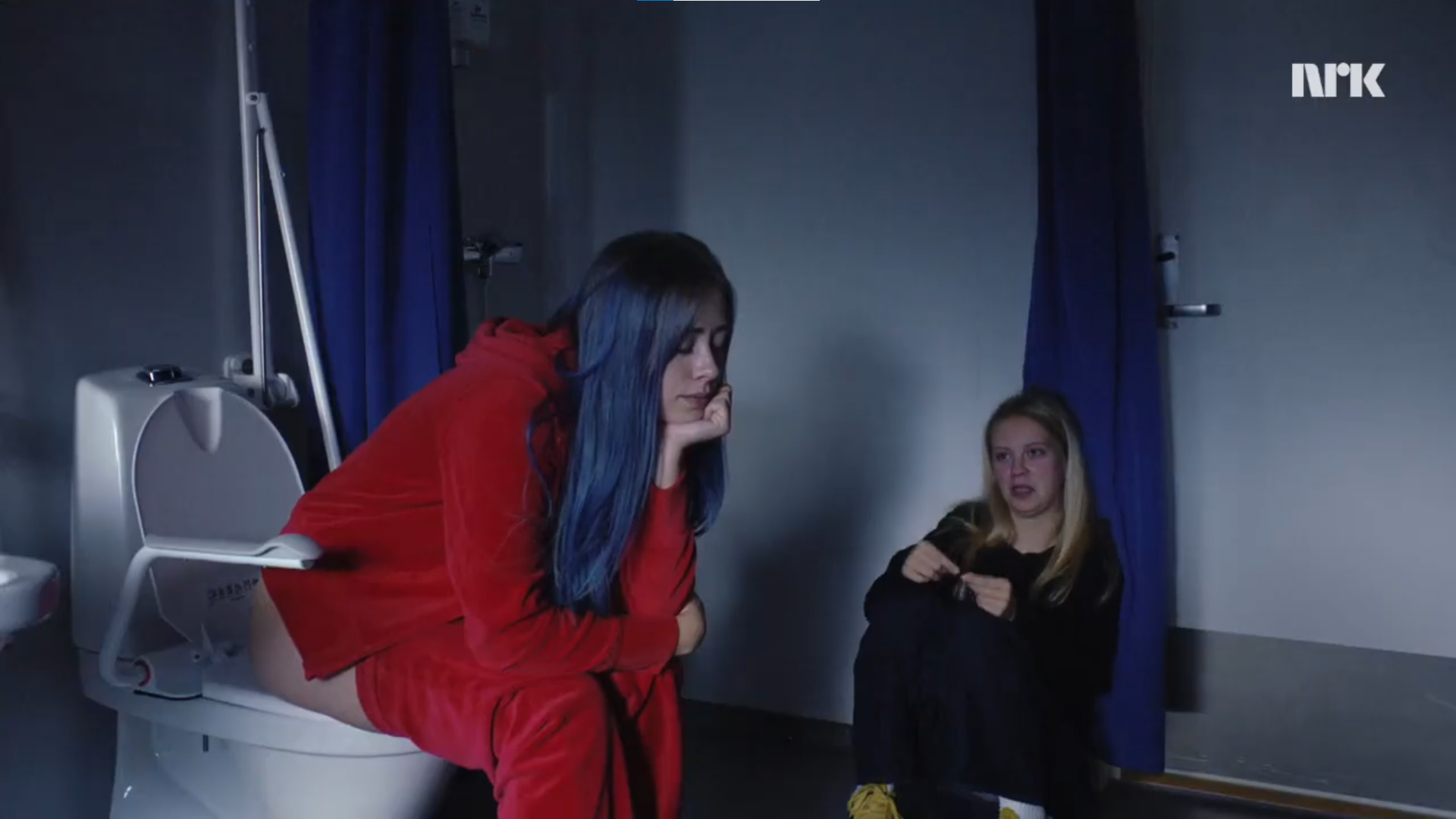 Sara (Silje Holm Carlsen) appears sitting on the toilet while chatting with her best friend Gunnhild (Kristine Ryssdalsnes Horvli).
