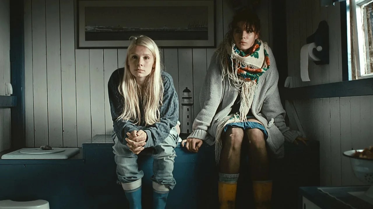 Elma (Pamela Tola) and Liisa (Pihla Viitala) appear sitting together in the public restroom.