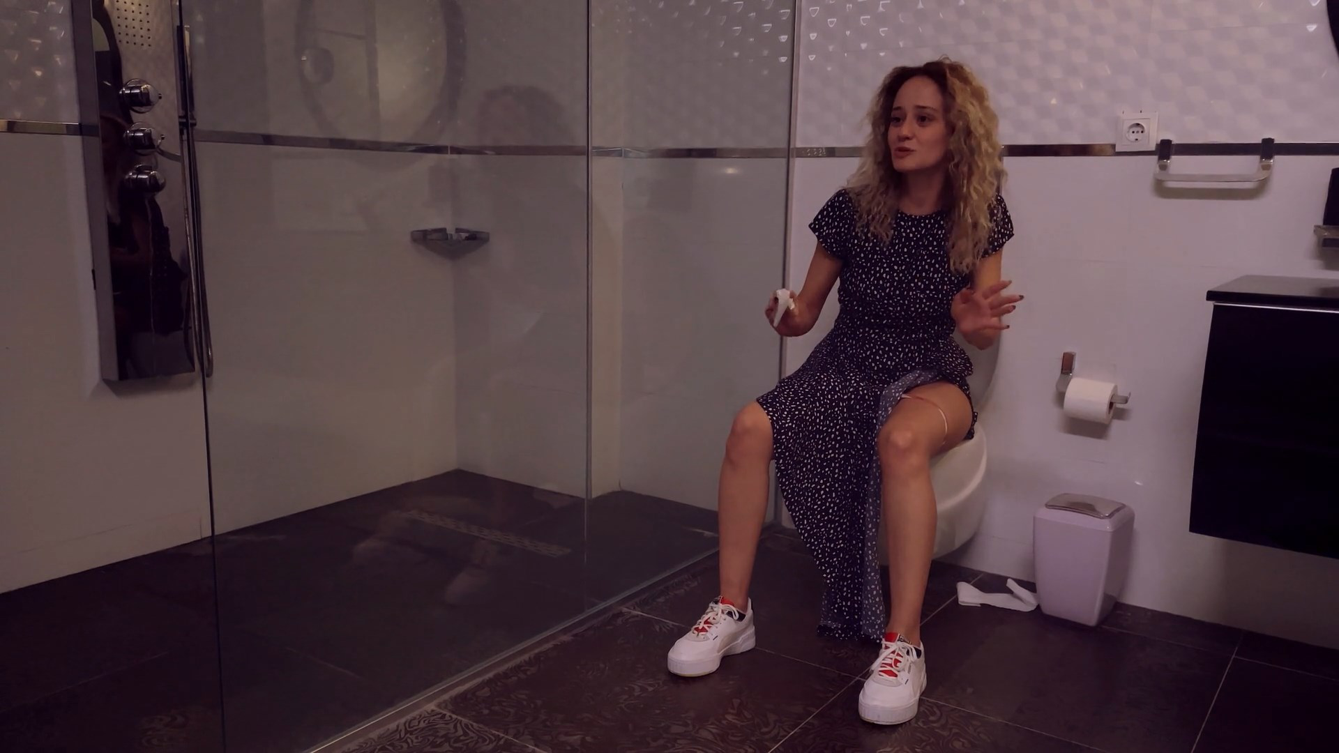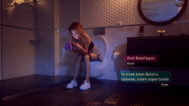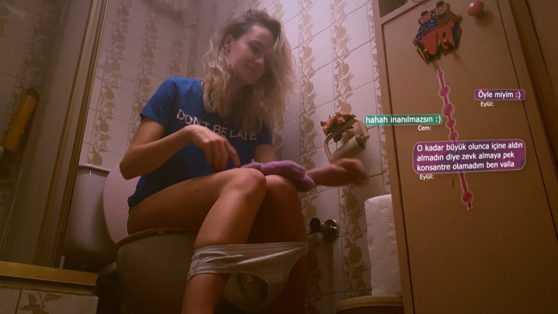 Eylül (Müge Bayramoglu) is shown sitting on the toilet for the second time while texting someone on her phone. She flushes the toilet while sitting down, and the scene cuts to her wiping herself with toilet paper.