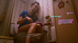 Eylül (Müge Bayramoğlu) appears sitting on the toilet again, chatting on her cell phone.