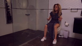Eylül (Müge Bayramoğlu) enters the bathroom, lowers the lid to place the container, pulls down her panties, and the scene cuts before she begins to urinate.